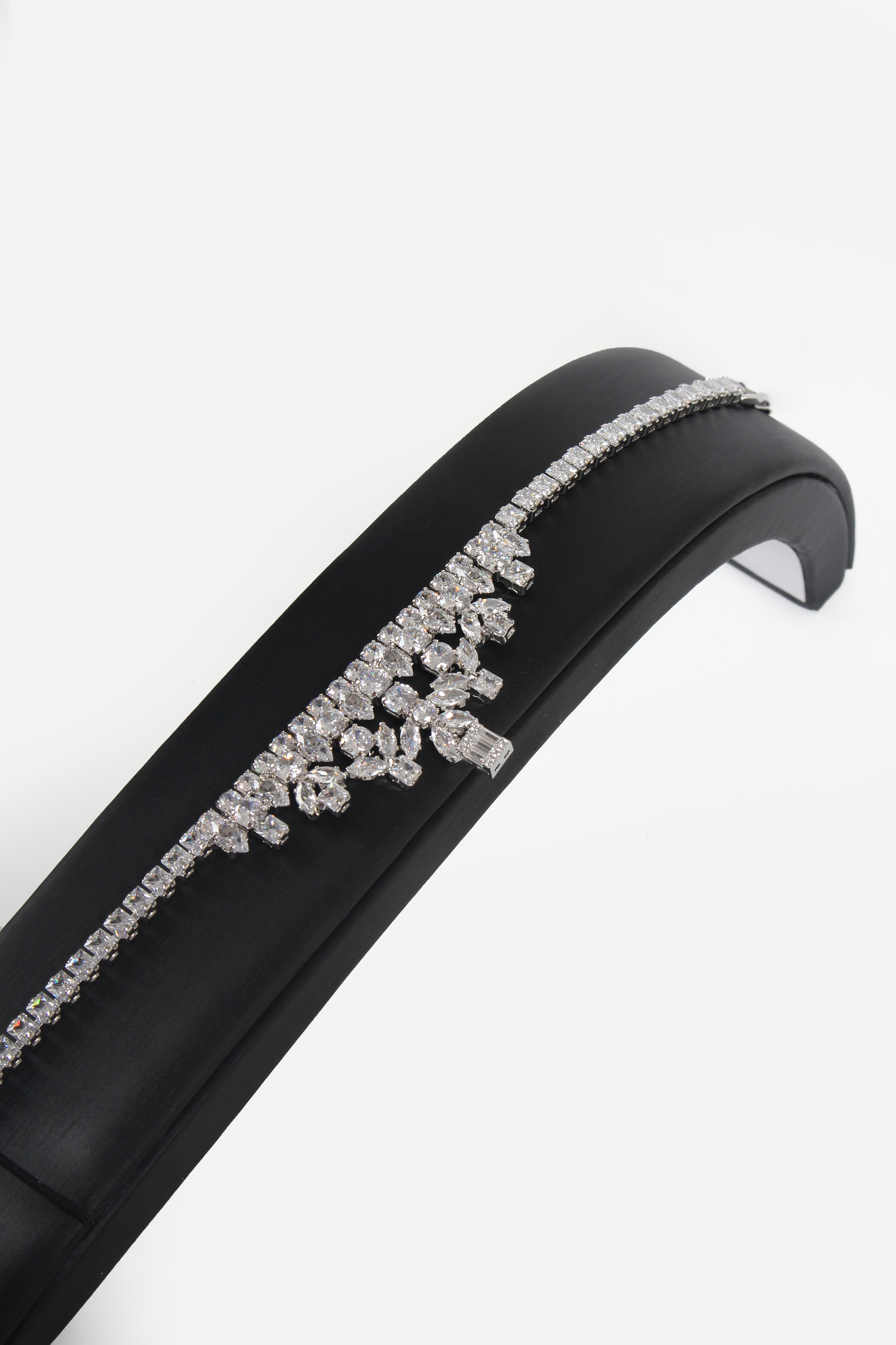 طقم زركون 4 قطع فاخر من زرتاج بتصميم فضي مشرق وأحجار زركون لامعة عالية الجودة يشمل سلسال حلق خاتم وأسوارة مطلي بالروديوم لحماية تدوم طويلاً.