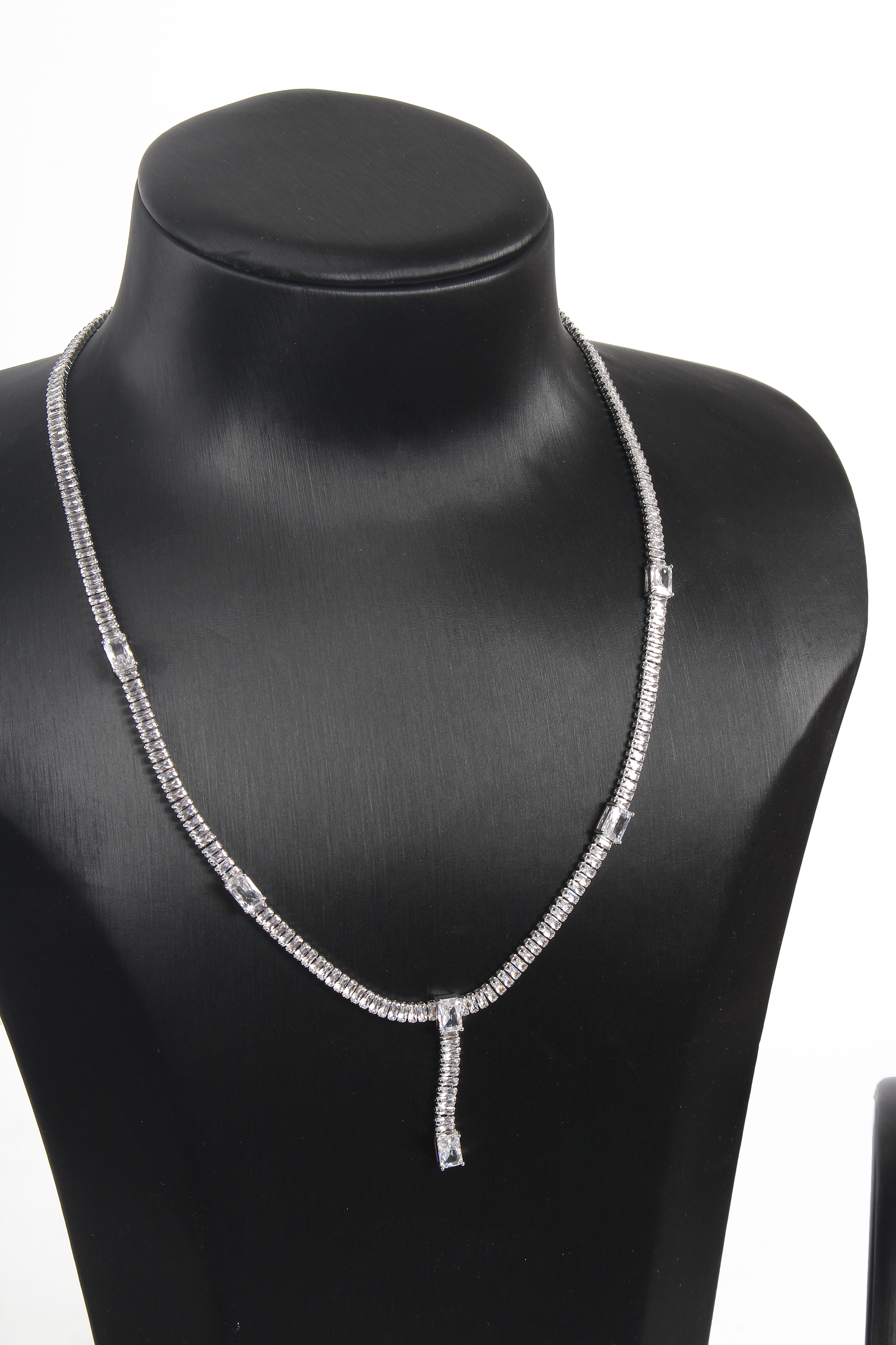طقم زركون 4 قطع فاخر من زرتاج بتصميم فضي مشرق وأحجار زركون لامعة عالية الجودة يشمل سلسال حلق خاتم وأسوارة مطلي بالروديوم لحماية تدوم طويلاً.
